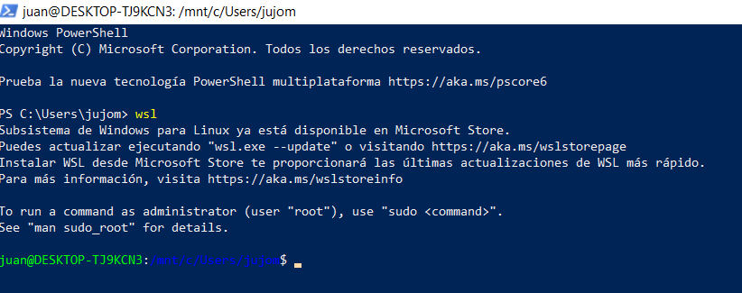 Abrimos nuestro powershell y escribimos el comando wsl, esto nos abrirá una terminal con la distro Ubuntu que hemos instalado previamente: